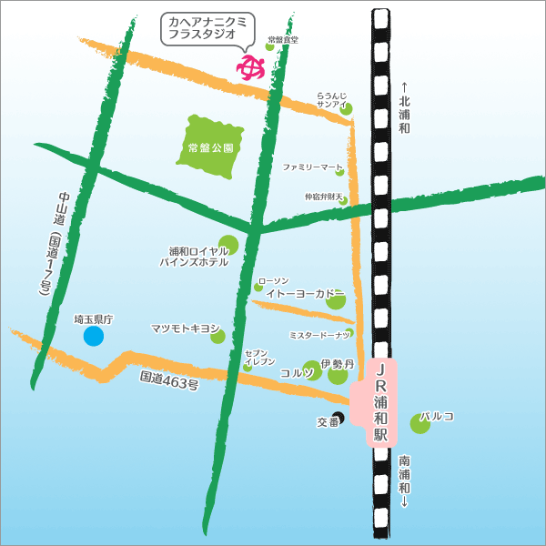ミスタードーナツ、イトーヨーカドー(浦和店)、浦和パーキングセンターなどの前を直進します。